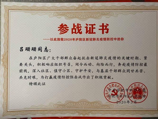 通过此次下沉经历,吕珊珊同志表示:“下沉社区,我真真正正的见识了什么是基层,直面疫情防控是对身体、心理的多重考验。简陋的值班条件,紧缺的防疫物资,不配合工作的居民,这些都不会让我们在这场防2疫中退缩,因为我们是共产党员。45天在一个人一生中是短暂的,但是2020年春天里的这45天,却会成为我永远无法磨灭的一段记忆。下沉工作虽然结束,生活、工作秩序也逐渐恢复,我将继续用行动践行入党誓词,履职尽责,投入到新学期的工作中。”