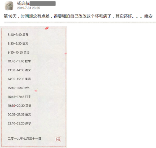 杨启航分别于2019年7月31日和2020年3月3日,在他的QQ说说中发表了如下动态,晒出了他自己的暑期和寒假学习时间表:
