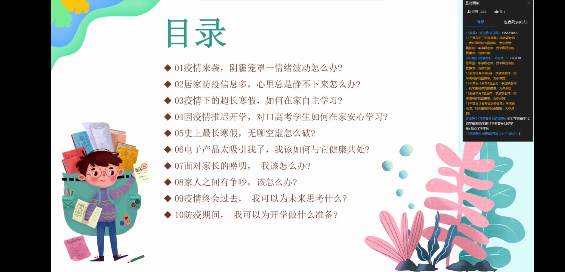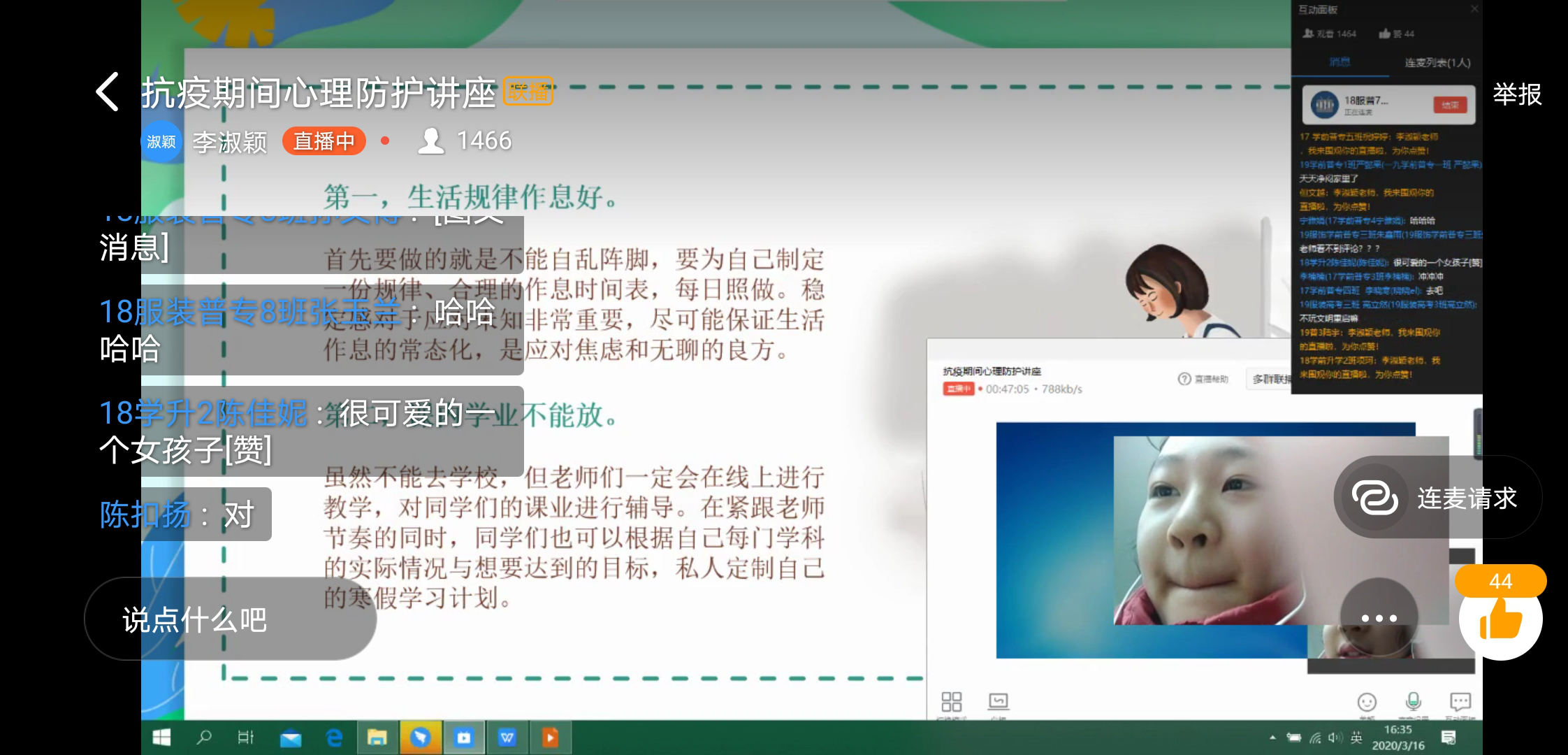 李老师的直播讲座紧扣疫情,播放时情视频和动漫抖音,关于怎样在疫情下提升学生自我防护意识,减轻焦虑情绪,制定学习计划,合理安排学习时间等问题做了讲解。由于这些话题切合实际,同学们听得十分认真,利用钉钉举手区域积极进行发言互动,争先恐后与李老师连麦互动,分享自己的切身体验和感受,在留言板块上有同一种声音,非常想早点回到校园。