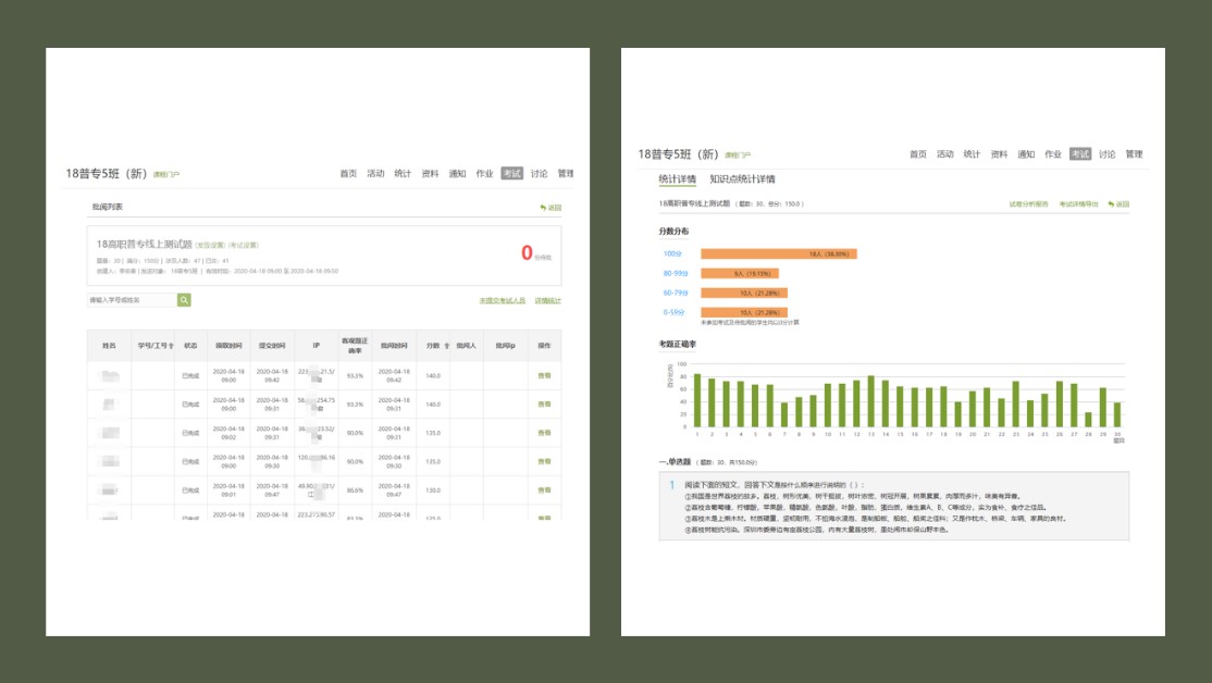 与传统教学方式相比,在线教学结合云端测试,可以及时多维呈现学生的学习情况,借助大数据进行教学分析,为教学设计提供合理依据。同时还可以针对每一位学生开展个性化辅导和分层教学,实现形成性评价和总结性评价等多元评价方式,真正做到因材施教,让分数不再只是数字,而是动态展示学生学习过程中点点滴滴的知识积累,教师教学过程中的每一份良苦用心。