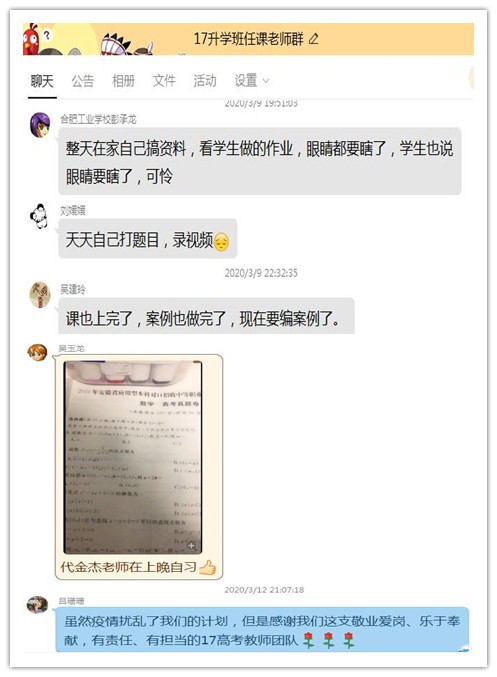 本着对师生、家长、社会高度负责的态度,为最大限度降低疫情对我校职教高考学子的影响,从2月3日开始,我校积极贯彻上级“停课不停学、离校不离教”的精神,对2020届职教高考班开展网络教学的工作做出了以下细致部署:一、明确教务处、学部、年级组、班主任及任课老师的岗位职责;二、由学部、教务处、校长室组成三级网络教学巡查,解决师生在上课时遇到的问题;三、学校专门创建“合肥工业学校在线教学技术服务”QQ群,安排超星公司技术人员随时解答任课老师遇到的技术问题,有力保障教学工作顺利进行;四、严格学生考勤制度。任课老师负责每节课的考勤并及时上报学部和学校,班主任跟踪调查学生缺勤的原因;五、年级组配合学部做好教学协调和服务等工作。学校与各学部全力配合,确保了2020届职教高考班在线课堂稳定、有序、高效。