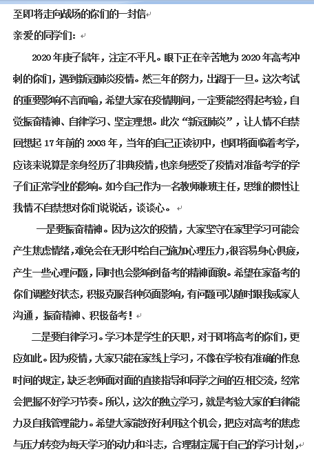 今天距离2020年职教高考预计倒计时30天了,因为一场新型冠状肺炎疫情,我们不能在教室里面对面共同冲刺高考,但我们同在空中课堂里相聚!我校服饰学部17级升学班班主任以一封信的形式给学生鼓劲加油,再次吹起冲锋的号角!看看他们是这么说的——