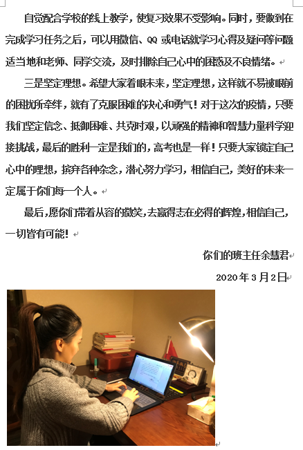 这场突如其来的疫情对高三备考复习产生了巨大的冲击,面对严峻的高考形势,考虑到高三学生临近高考的特殊性,在不违背相关防控原则、要求的前提下,本着“停课不停学”的原则,我校制定了高三年级“停课不停学”学习方案。对各位家长如何在这个特殊时期做好配合、协调以及学生管理等方面也进行了布置和要求。至此,在家长的大力支持和辛苦付出下,班级线上课程出勤率、作业完成率都较好,知识巩固率超出预估。在此,对各位家长表示深深的谢意!
