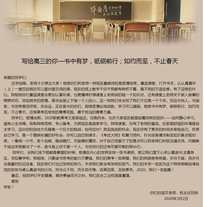 17学前升学2班班主任刘琼老师“写给高三的你——书中有梦,砥砺前行;如约而至,不止春天”: