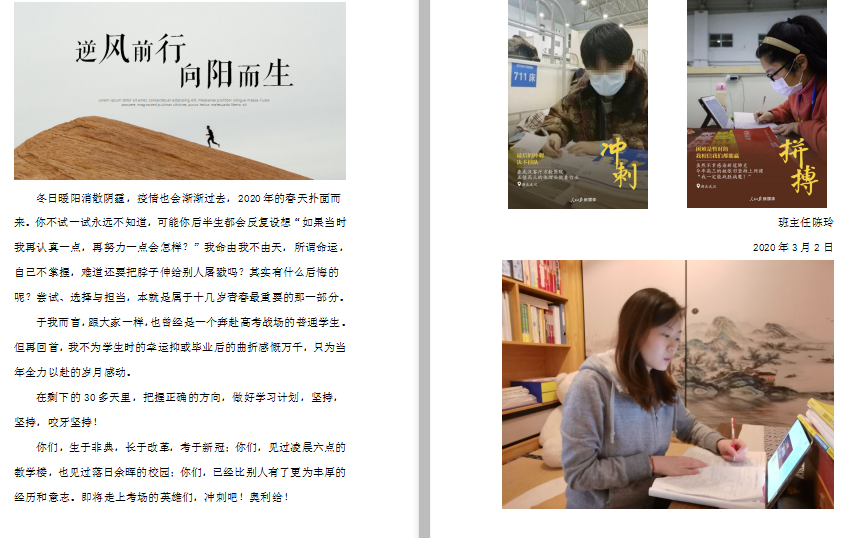 眼下,3月份又掀起了新一轮线上课程的教学,原定于3月份的对口高考时间是否有变,我们不得而知。但全体师生和家长在迎战高考的路上从没有停止。班级群按照原时间每天公布高考倒计时,目的是营造高考氛围,提醒同学们不忘初心。老师们认真备课制定饱满的教学计划并稳步实施,同学们也是稳中有序的进行着自己的学习。同学们的学习劲头在这次特殊的疫情期间反而表现出了饱满的斗志和良好的心理素质。种种良好的表现来源于师生的共同努力,来源于家长的无私付出和理解。让我们在2020的高考路上一起勇敢前进,在指日可数的日子里争分夺秒,不畏挑战,勇敢前行!