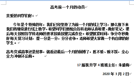 17服装升学4班朱腊梅老师高考前一个月动员如下: