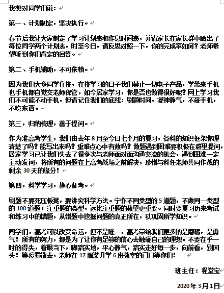 17服装升学6班班主任程堂宝老师是这样对同学们说: