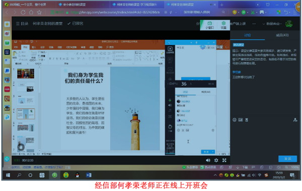 3月2日起,我校全面开展了线上教育教学活动。根据当前疫情防控形势,结合我校疫情防控工作实际和学生特点,由学生处牵头,在3月2日下午第三节课组织全校各班级开展了形式多样、内容丰富的网络主题班会。此次班会以“责任与担当”为主题,旨在了解学生的个人规划及动态,积极引导学生做防控疫情的坚定拥护者、防控工作的坚定落实者,学会立足当下,只争朝夕,不负韶华,勇于肩负起时代赋予的使命与责任。