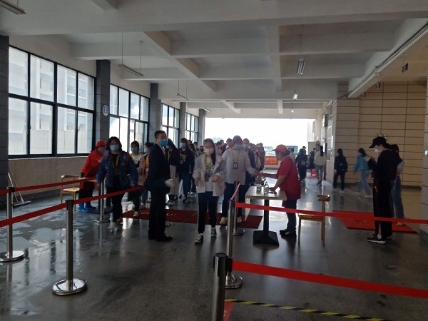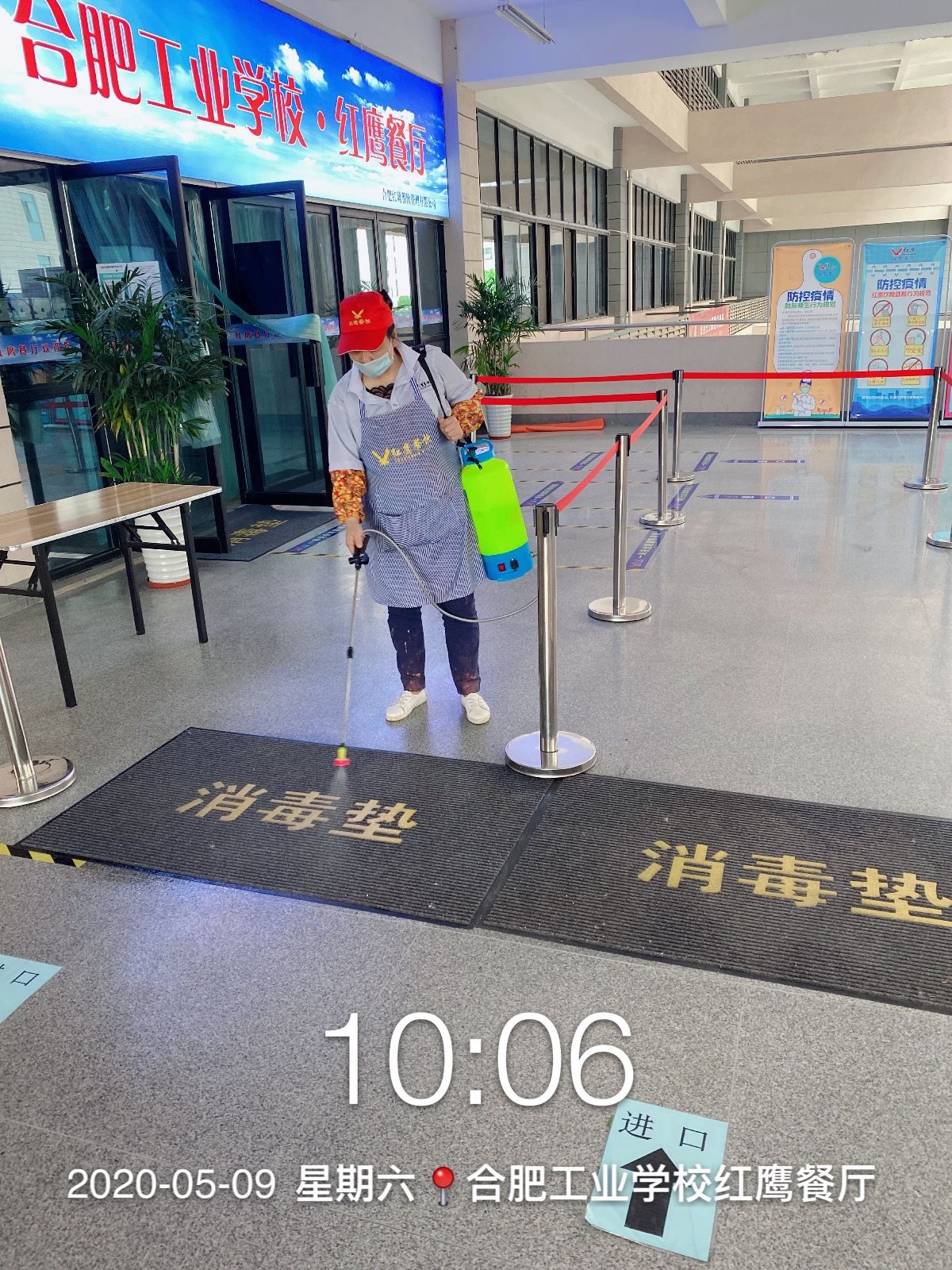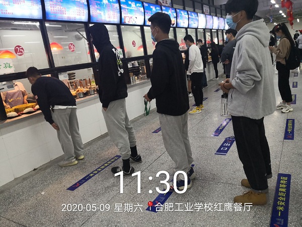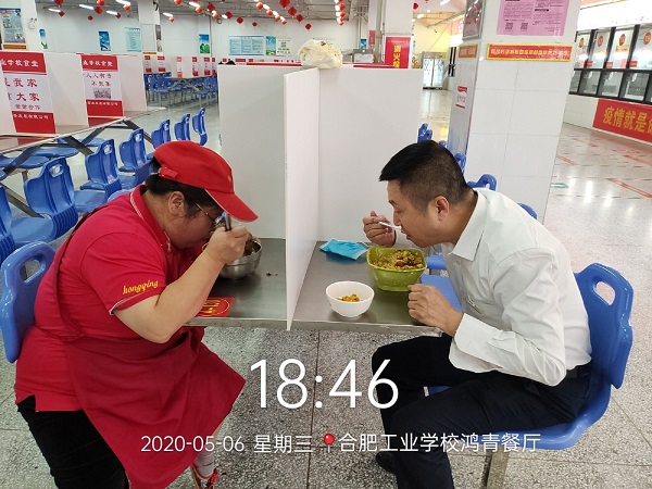 在餐厅入口处,设置两条警戒通道护栏,每条通道一次仅容一人通过,并安排专人用免洗酒精为学生洗手消毒;在餐厅窗口处设置多点一米安全警戒线,严禁学生聚集拥挤,餐厅每天派安全劝导员监督;在餐桌上设置隔离挡板,每人都分区间就餐,尽最大可能避免交叉感染。