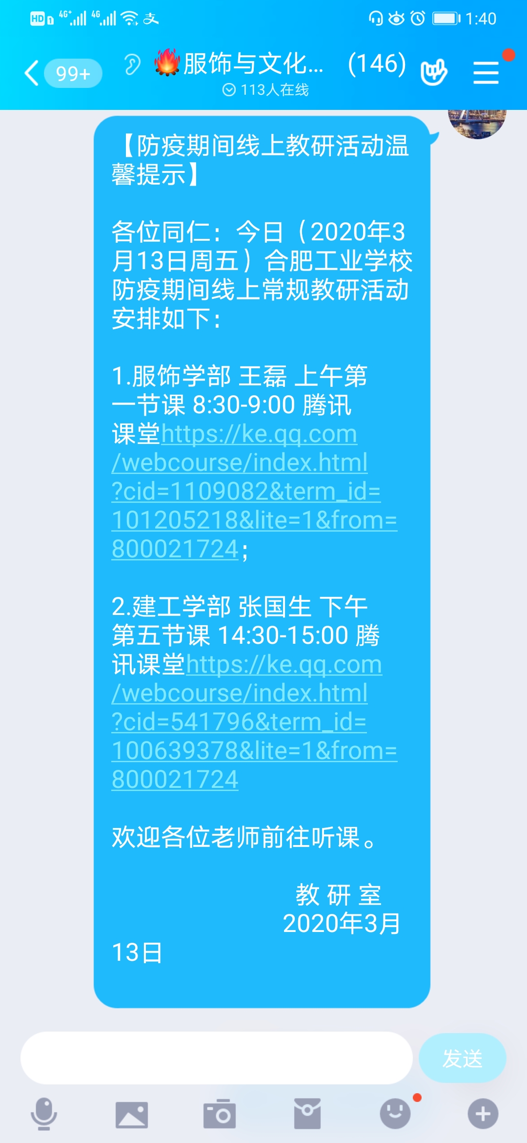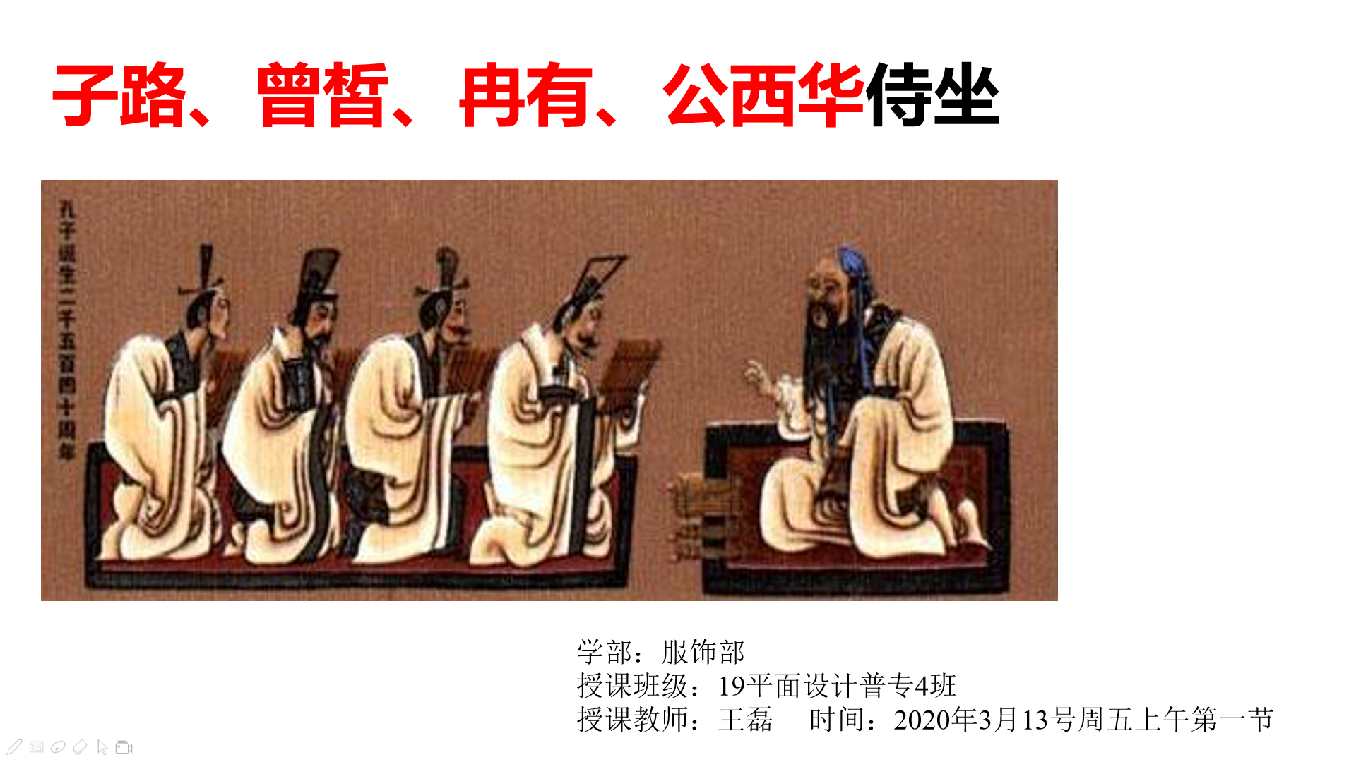 服饰学部语文组王磊老师于3月13日第一节课在腾讯课堂上率先面向全校83位师生开展了《子路、曾皙、冉有、公西华侍坐》线上公开课教学活动,同学们身临其境感受以孔子为代表儒家“礼乐治国”。王磊教师精彩的讲解课文,结合同学们线上“举手”连麦问答互动,完全消除了隔空距离,体现了教师充分利用现代信息媒体,发挥"互联网+教育"作用,在观摩师生中反响良好。