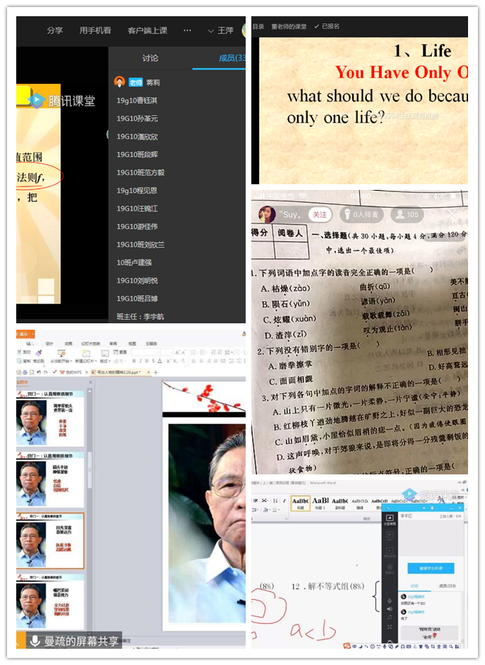 由于有了前期的准备和试行,3月2日的全面线上开学工作顺利有序。我校实施三级教学巡查,由校长室、学校教学管理处室和学部逐级负责,全体教学巡查人员加入班级群,随时了解上课情况,每天汇总“线上班级日志”和巡查情况,形成学部“线上巡查表”,并及时将学校和学部巡查情况反馈到学部教学群里。逐级细致的教学巡查和反馈促使线上课堂教学和班级管理更加规范和严格。课前,老师们将课程邀请码或相关课程链接发布到班级群或学部教学群,班主任会在班级群里发布群接龙或者群打卡,方便统计学生在线情况。很多班主任进驻在线课堂随班听课,即时查看班级状况,对于不在课堂的同学能够及时通知。目前,大多数老师已经熟悉各类授课软件的使用。从统计上看,腾讯课堂,腾讯会议的使用率较高。教师授课态度认真,无论是直播还是PPT演示都准备充分。对于实操性内容,如体育课,教师多采用屏幕展示或自身演示,学生在评论区进行辅助操作并及时回馈的形式,但是部分技能实操无法进行实际训练。