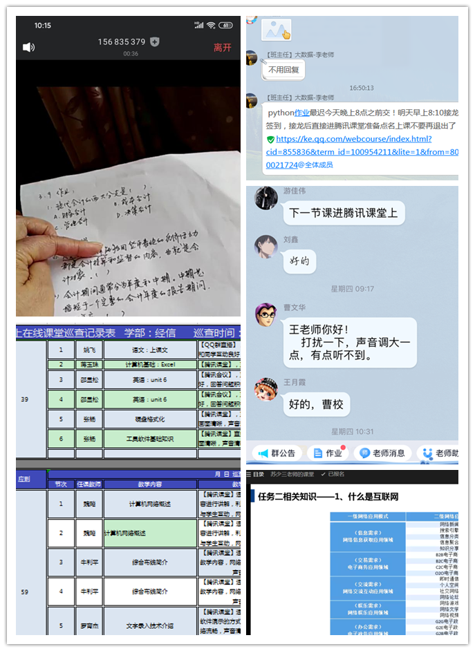 2月13日~28日期间,教师普遍使用“学习通”进行教学,但随着平台因流量导过大致卡顿问题,大家尝试学习使用多种教学软件,如腾讯课堂、腾讯会议、群直播、Bilibili、快手、钉钉等。由于大多数课程是合班上课,线上巡查考勤比较困难,需要与班主任和授课教师核对很多数据信息,每天要花费很多时间完善“线上巡查表”。通过一段时间的摸索、学习,老师们从一开始的紧张不适应变得自然、自如,教学巡查工作也从协助督促逐步向改进提高转变。