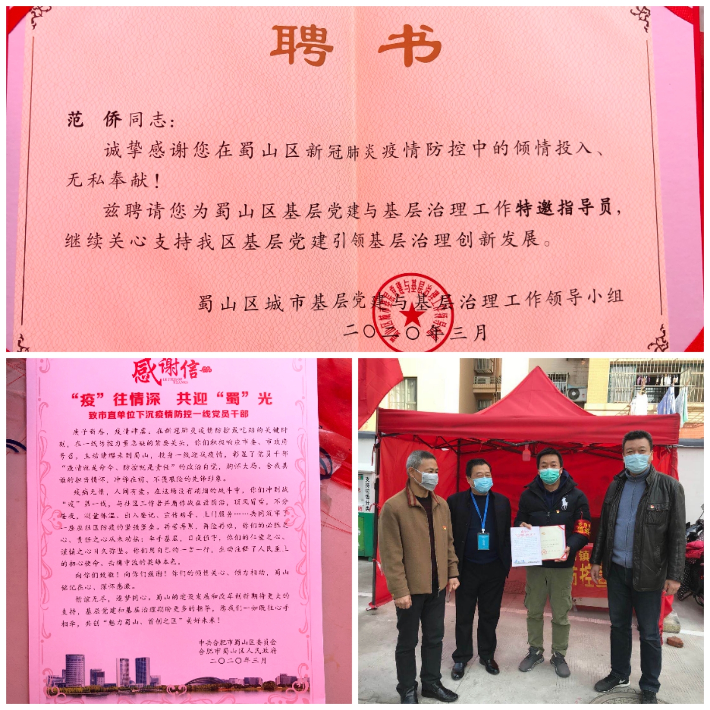 在井岗镇疫情防控点的这段时期,范侨同志始终坚守岗位,深入小区一线,宣传防疫知识,走访排查及时掌握居民详细情况的第一手资料,积极勇敢配合社区做好各项工作,为社区阻击防护疫情筑起了一堵坚实的“防护墙”。3月14日,蜀山区井岗镇领导和蜀山社居委书记来到疫情防控点,他们为范侨同志分别送来了感谢信和颁发“蜀山区基层党建与基层治理工作特约指导员”的聘书。