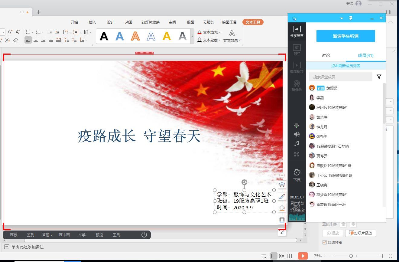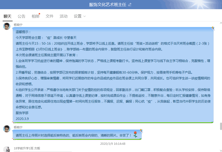 3月9日下午,我校服饰学部33个班级如期召开了主题为“疫路成长,守望春天”的线上主题班会课。