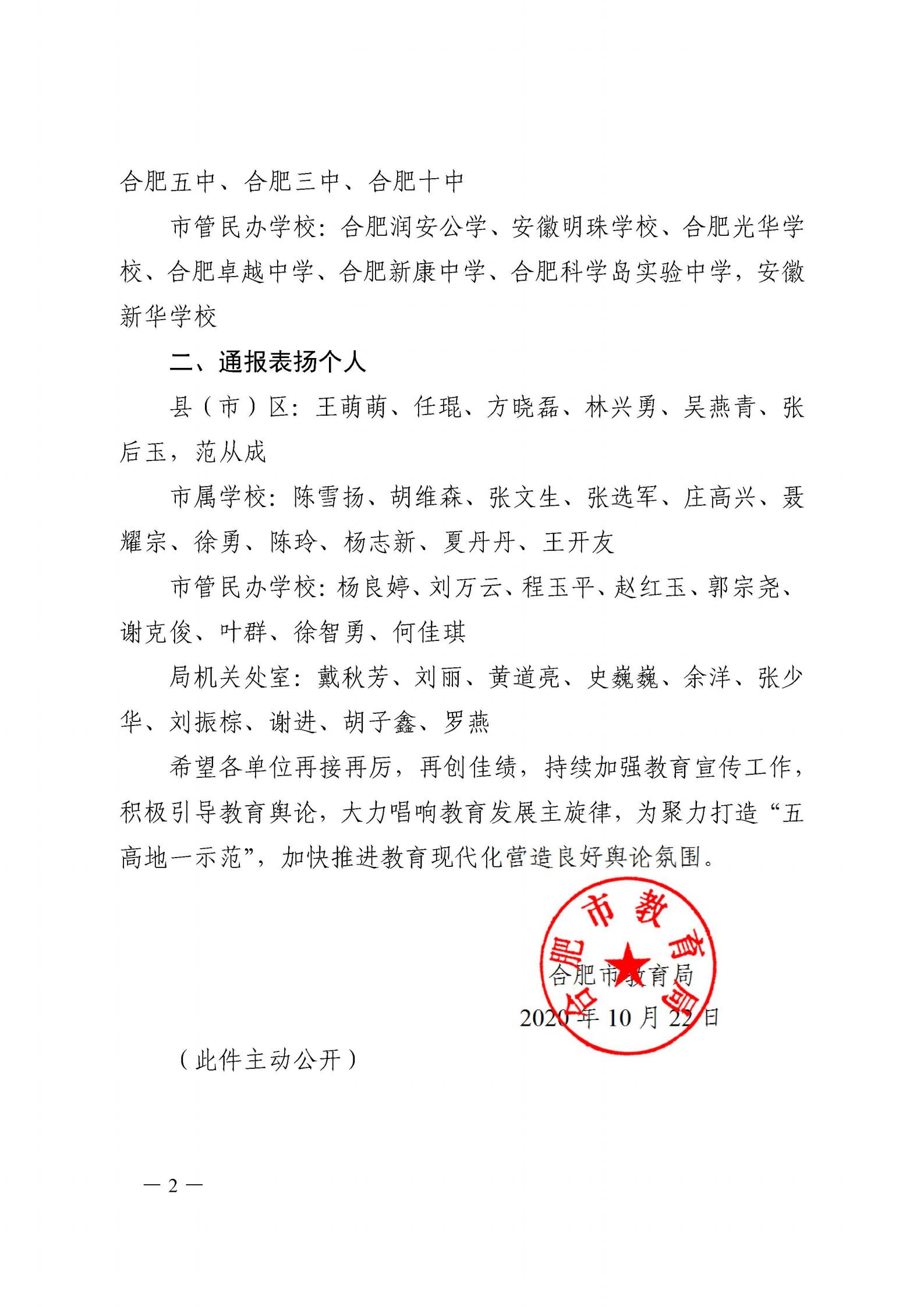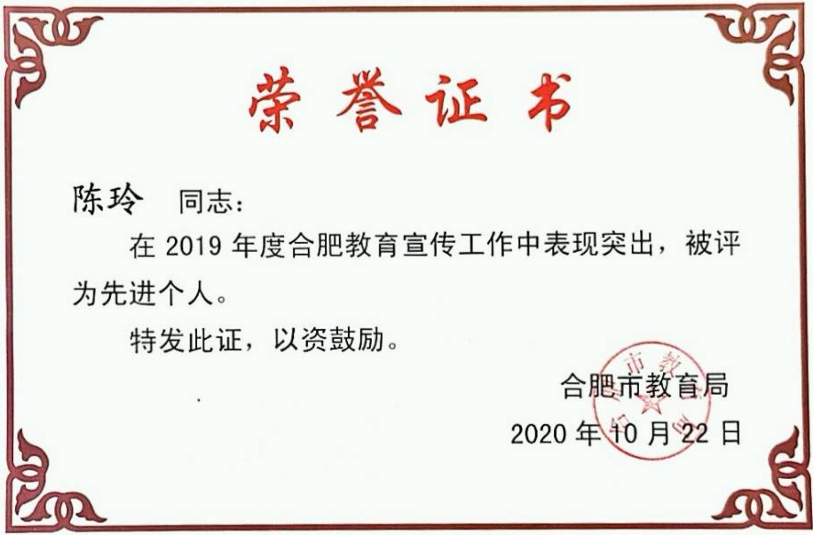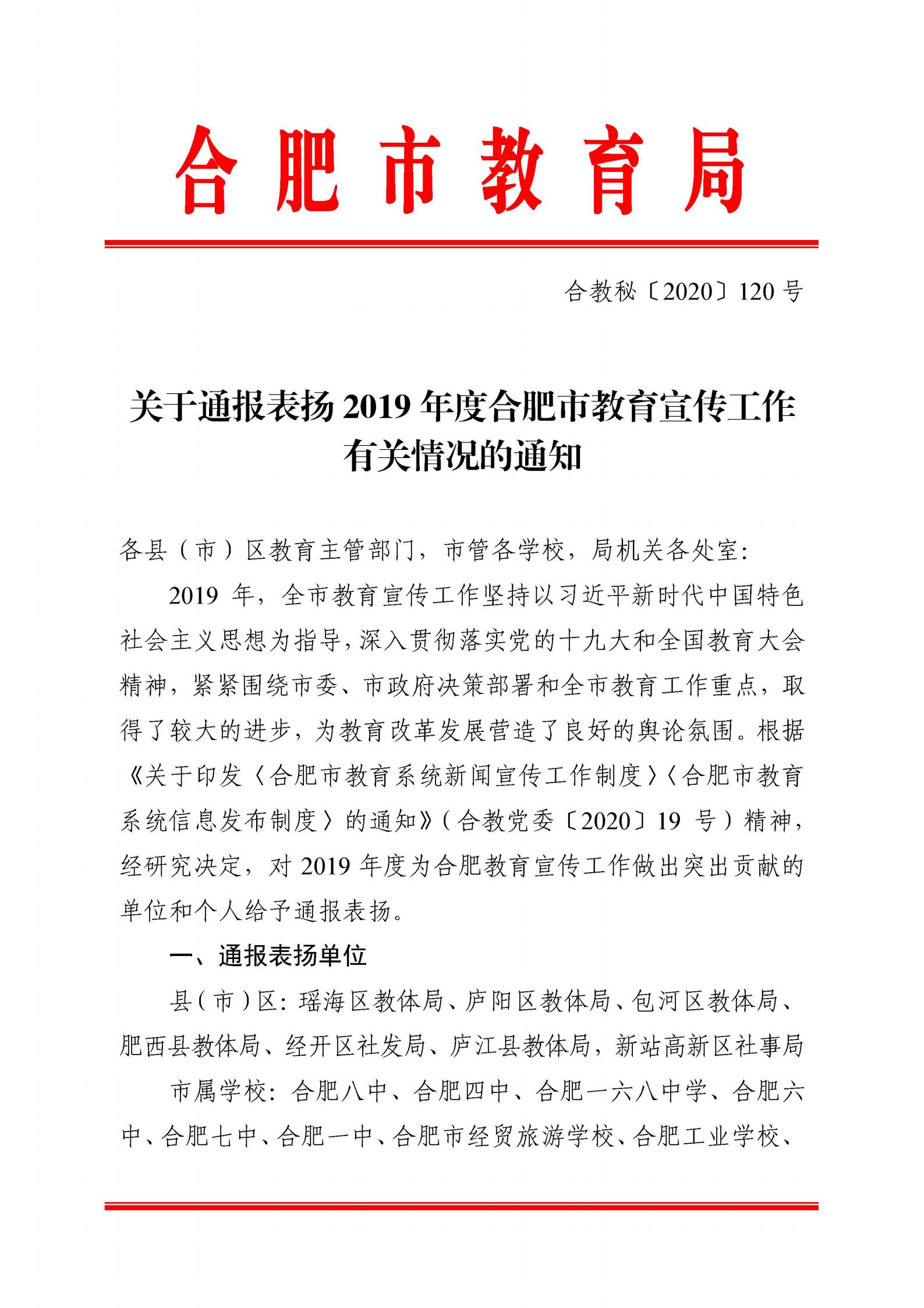 近日,合肥市教育局印发《关于通报表扬2019年度合肥市教育宣传工作有关情况的通知》(合教秘〔2020〕120号),对2019年度为合肥教育宣传工作做出突出贡献的单位和个人予以通报表扬,我校荣获“合肥市教育宣传工作先进单位”,陈玲老师获得“合肥教育宣传先进个人”。