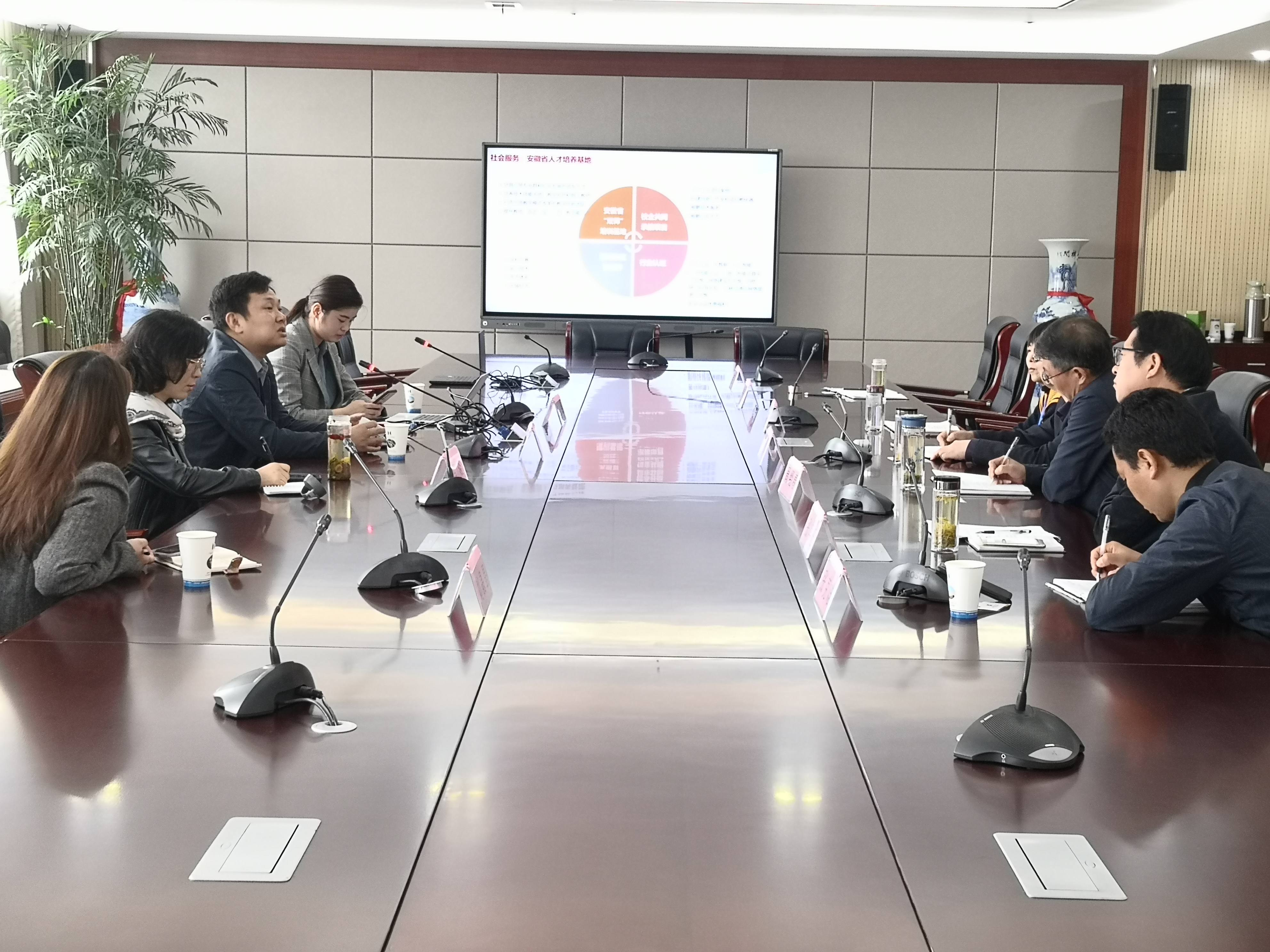 10月20日上午,华为公司安徽政企业务副总经理李华强、教育行业解决方案经理李俊红、合肥卓瑞信息技术有限公司总经理冯焱、副总经理刘晶晶等一行四人来到我校,就智慧校园建设、智能制造相关专业建设等进行校企合作交流洽谈。副校长曹文华、教研室主任张其旺、实训处处长周经春、学生处副处长张克难、招就处副处长赵平、经济与信息技术学部主任董云霞、副主任侯小捷参加了交流会。