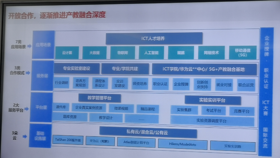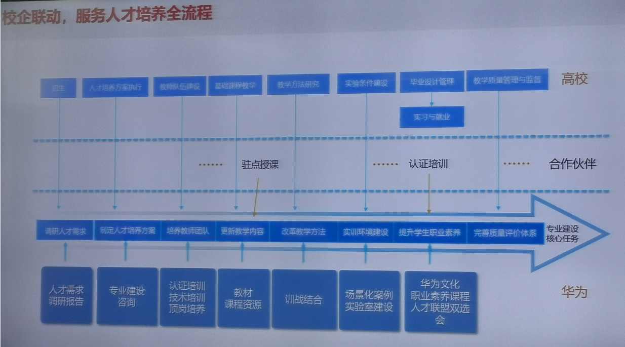 李俊红经理从政企合作项目、产教融合,校企合作等三个方面进行了详细的汇报,在产教融合校企合作人才培养方面做了重点介绍,并就华为公司智慧校园“五个一”建设方案进行了解读。华为公司在ICT学院、华为认证、华为云中心、1+X证书认证等方面具有强大技术实力,为校企合作 “平台+生态”战略核心提供有力支撑。