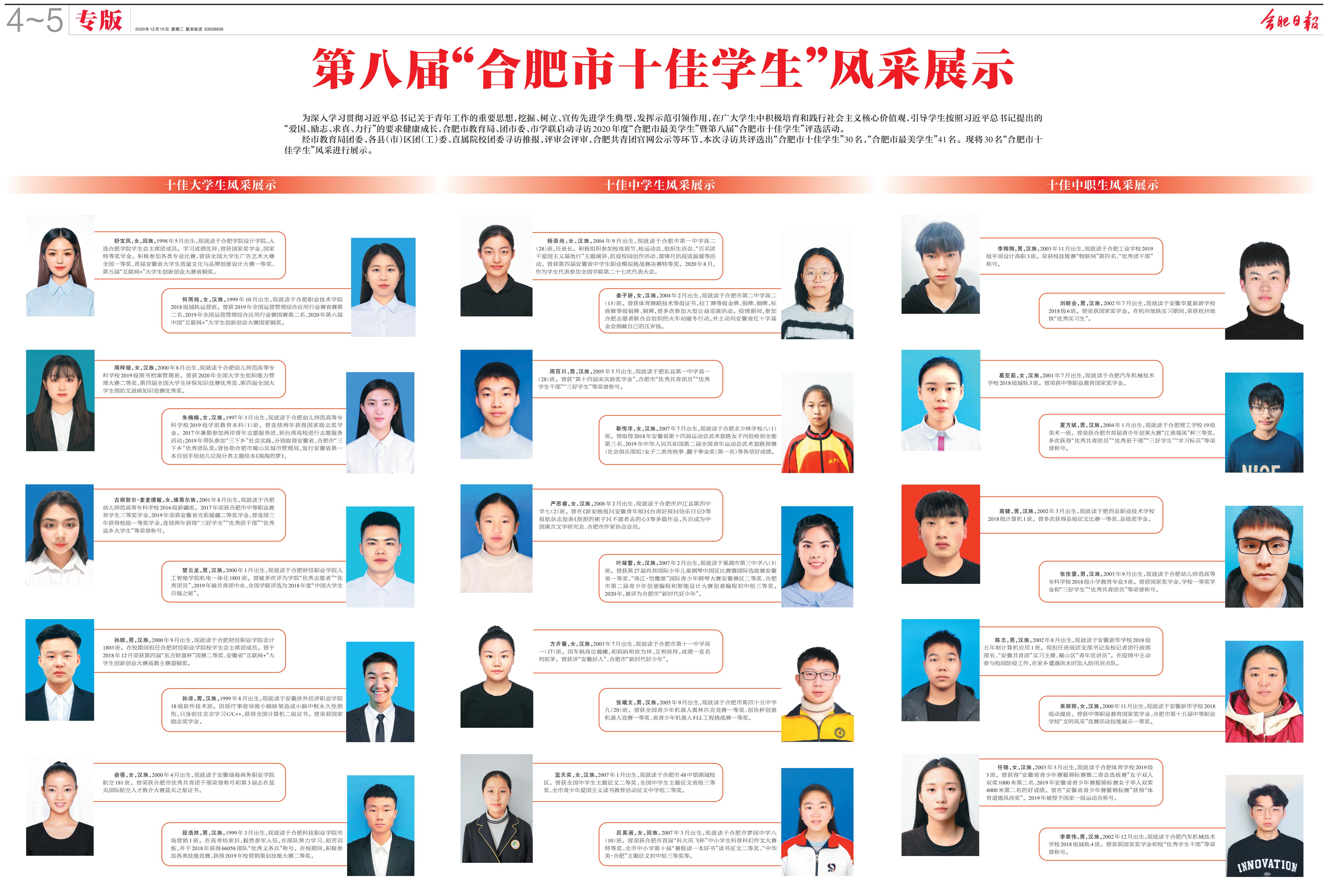 近日,由合肥市教育局、团市委、合肥市学生联合会共同举办的2020年度“合肥市最美学生”暨第八届“合肥市十佳学生”评选活动落下帷幕,我校李翔翔同学喜获“合肥市十佳中职生”荣誉称号,王正跃同学喜获“合肥市最美中职生”荣誉称号。