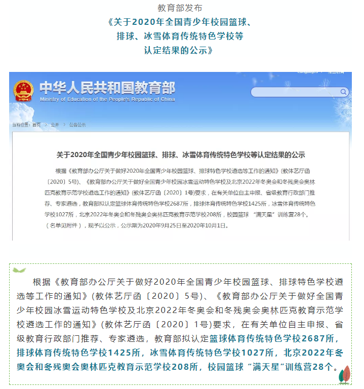 根据《教育部办公厅关于做好2020年全国青少年校园篮球、排球特色学校遴选等工作的通知》(教体艺厅函[2020]5号)要求,经过单位自主申报、省级教育行政部门推荐、专家遴选的层层筛选,教育部拟认定篮球体育传统特色学校2687所,我校脱颖而出,位列其中。
