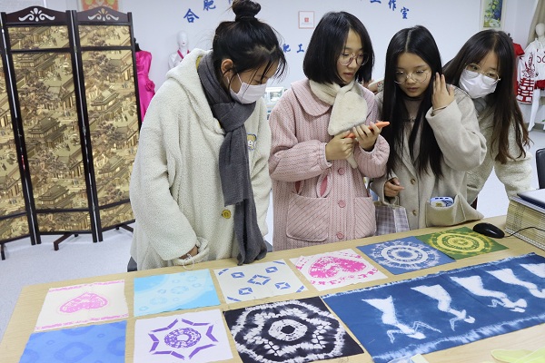 教育是一棵树摇动另一棵树,一朵云推动另一朵云,一个灵魂唤醒另一个灵魂。研讨交流结束后,工作室展示了最新扎染作品,吸引了众多爱好扎染艺术的学生们。