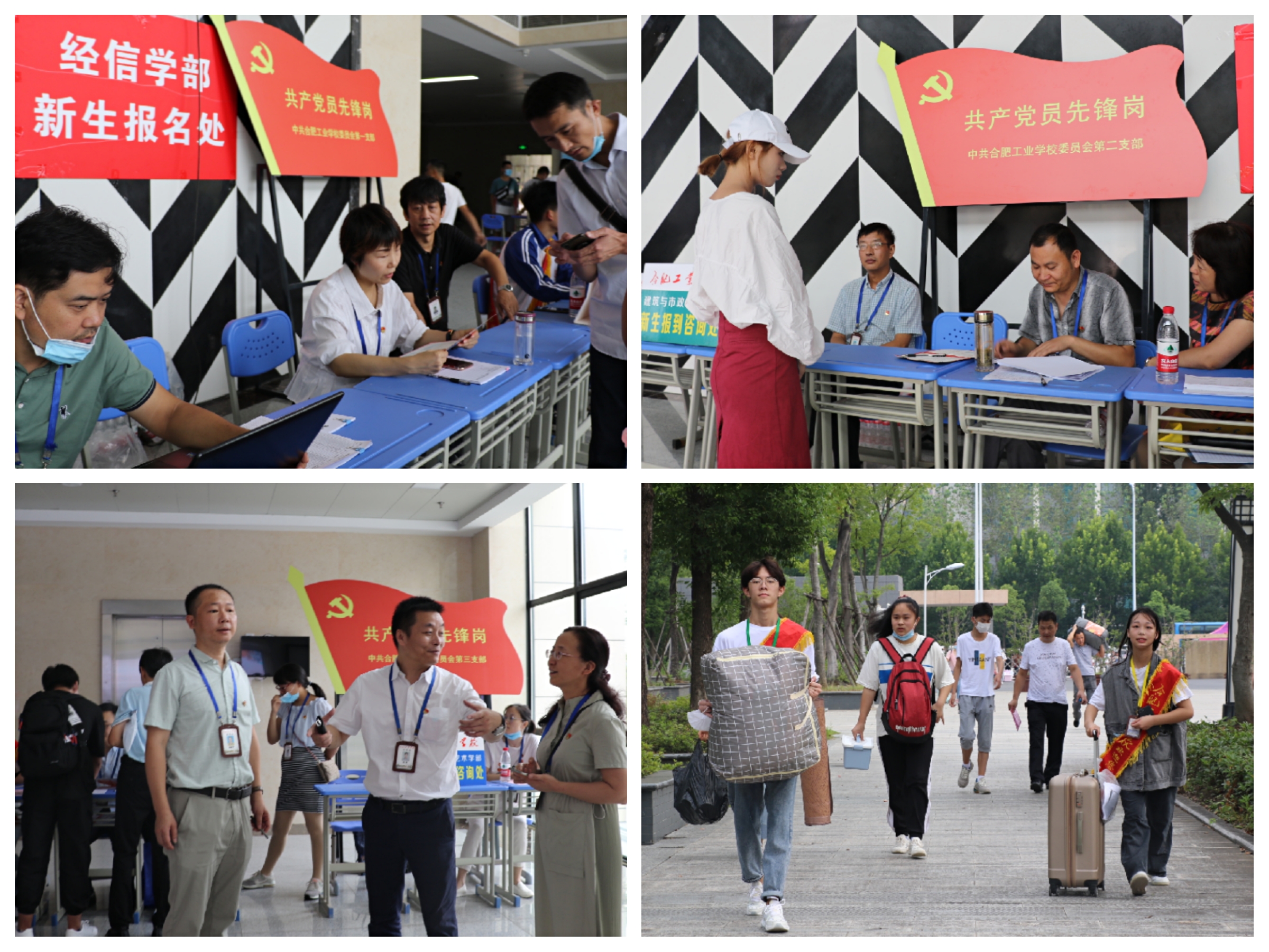 热心的志愿者们积极主动引导新生到达对应学部、班级,整齐有序地排队报到,并不辞辛苦手提肩扛帮忙搬运行李,忙碌的身影穿梭在校园之中。学校三个党支部还专门设立共产党员先锋岗,党员同志们积极发挥模范带头作用,不畏炎热,忙着服务新生、家长,指引入学流程,解读资助政策,让新生和家长留下一幅幅温馨感人的画面。