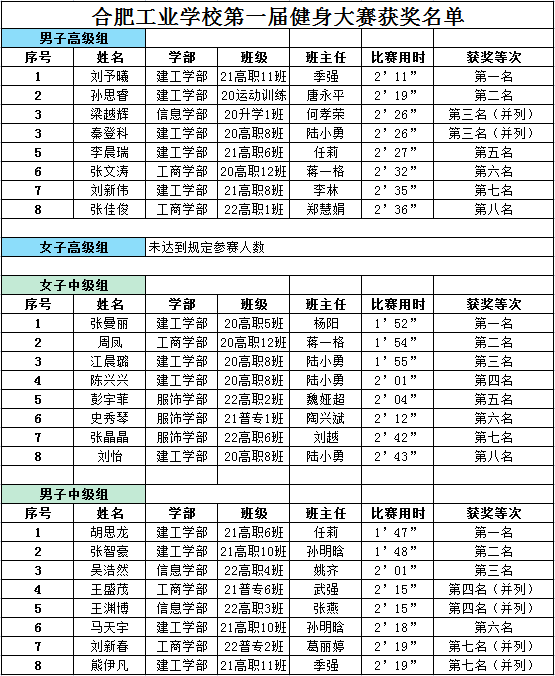 此项比赛以体能为主,包括上肢、下肢、核心力量以及灵敏性、耐力等指标的测试。经过紧张激烈地预赛、决赛角逐,最终建工学部21高职11班刘予曦获得了男子健身组高级组的第一名,建工学部20高职5班张曼丽获得女子健身组中级组的第一名,建工学部21高职6班胡思龙获得男子健身组中级组的第一名。同学们纷纷表示,此次健身比赛很有意义,大家在训练场上精益求精,在竞技场上才敢争第一。汗水必将在奋斗中结出硕果,让青春在拼搏中飞扬,不断争取更好的成绩。