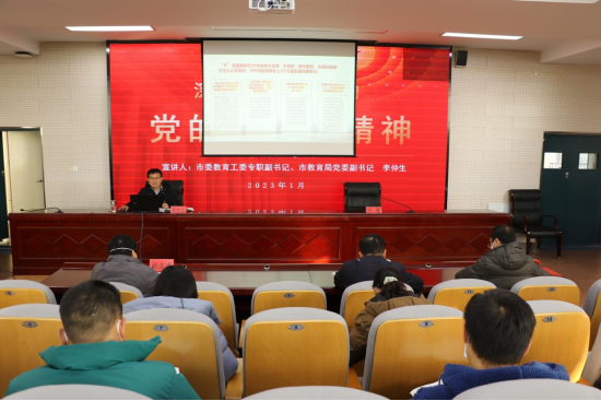 2023年1月6日下午,市委教育工委专职副书记、市教育局党委副书记李仲生在合肥工业学校开展党的二十大精神专题宣讲。学校全体中层及以上干部、各党支部支委参会,校党委书记校长孙健主持宣讲会。