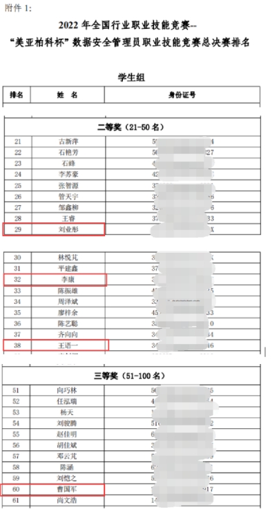 全国数据安全职业技能竞赛“美亚柏科杯”数据安全管理员职业技能竞赛总决赛在福建厦门举办。我校四人获奖。刘业彤(班主任:张杨)、李康(班主任:张杨)、王语一(班主任:童亚运)三位同学在获得二等奖,曹国军(班主任:张杨)获得三等奖。