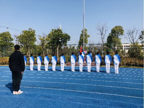 “迎国旗!”随着指挥员口令下达,由14名同学组成的国旗护卫队,迎着初升的朝阳,拥着鲜红的国旗,迈着铿锵的步伐,阔步走向国旗台。“升国旗,奏国歌!”鲜艳的国旗在激昂雄壮的《义勇军进行曲》中冉冉升起。