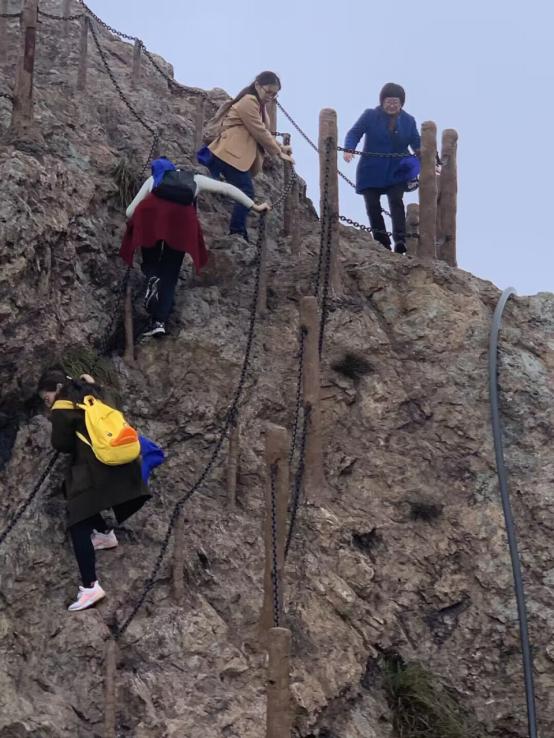 奇丽的风景吸引着老师们。女教师们平时既要忙于工作,又要兼顾家庭,有的老师还有恐高症,原生态的黄山寨给老师们的攀爬带来了很大的挑战,尤其是山顶的几处狭窄、陡峭处,仅能一人通过,甚至要手脚并用方可前进。女教师们努力坚持,相互鼓励,相互照应,工委们按照分工前后做好保护,最终女教师们成功挑战自我,到达山顶。
