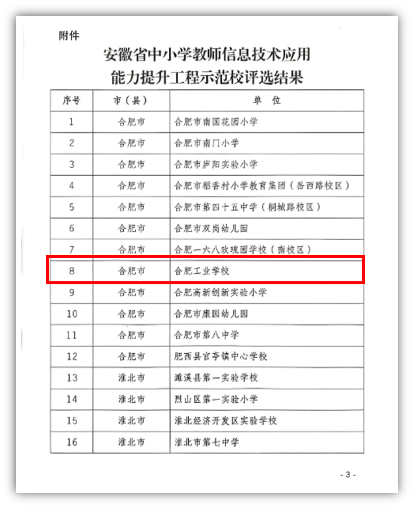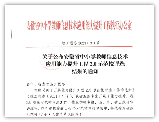 近日,安徽省中小学教师信息技术应用能力提升工程执行办公室下发了《关于公布安徽省中小学教师信息技术应用能力提升工程2.0示范校评选结果的通知》,在经过县、市、省三级评审流程后,178个示范校申报单位中,择优确定的47所省级示范校,合肥工业学校作为合肥市唯一入选中职学校,荣获省级示范校认定。