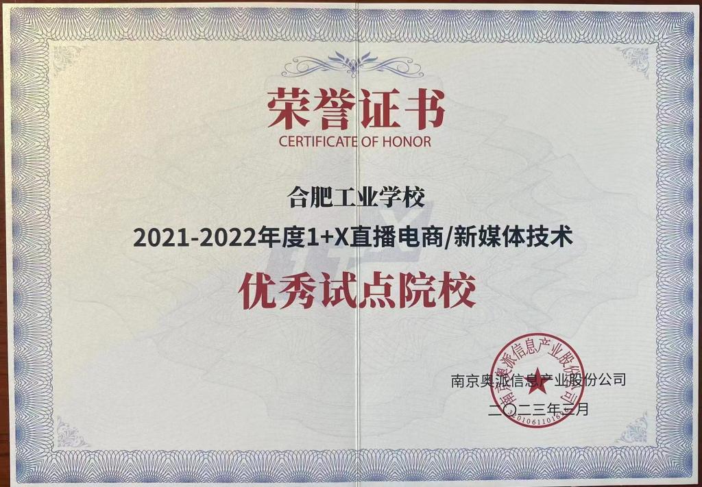 近日,合肥工业学校荣获奥派股份授予的2021-2022年度1+X直播电商/新媒体技术优秀试点院校称号,这是对我校1+X试点工作开展的高度认可。