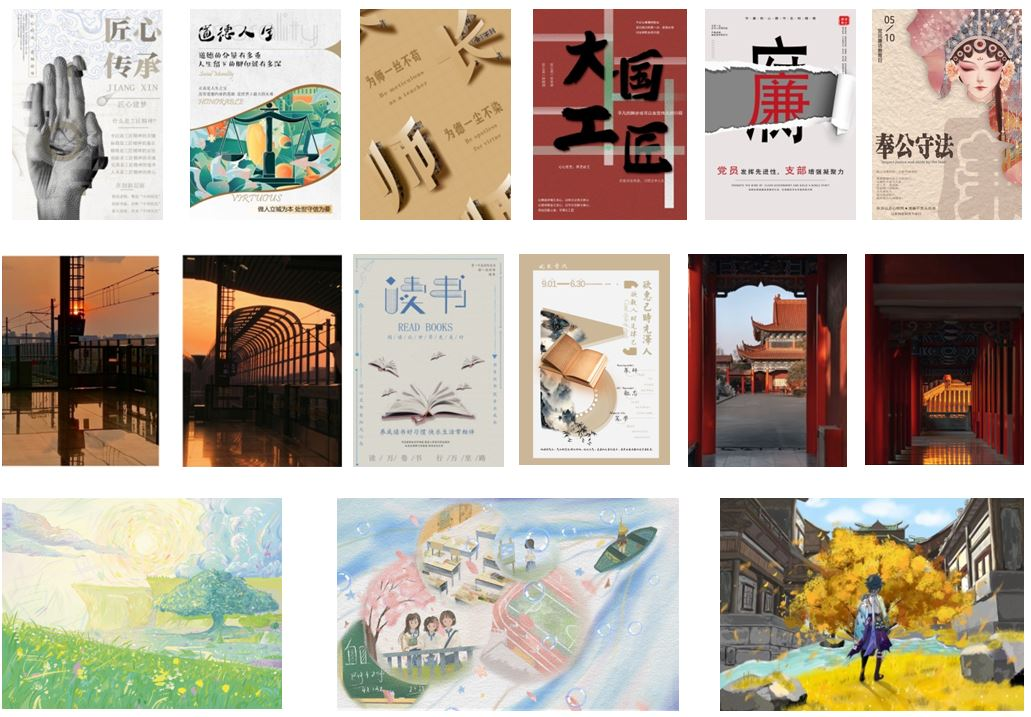 学部20级计算机平面设计、美术绘画、移动应用技术与服务三个专业的全体学生参加了本次毕业设计,学生作品题材和形式丰富,涵盖了平面设计类(包括:标志Logo设计;平面海报设计;书籍装帧设计;产品包装设计等)、视频动画类、摄影类、手工制作类四大类作品。作品突显工匠精神、职场文化、德智体美劳全面发展、营造优良学风、良好师德师风、教师职业发展、廉洁文化等主题。