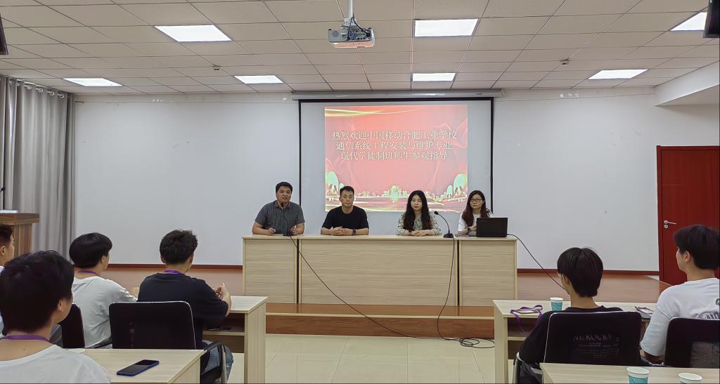 中国移动公司员工对我校师生表示热烈欢迎。培训基地负责人郑总对基地进行介绍,对企业所需的人才要求进行说明,使学生对接下来的参观充满好奇与期待。