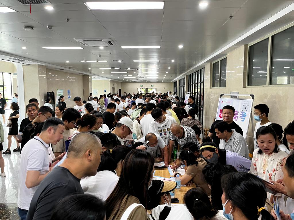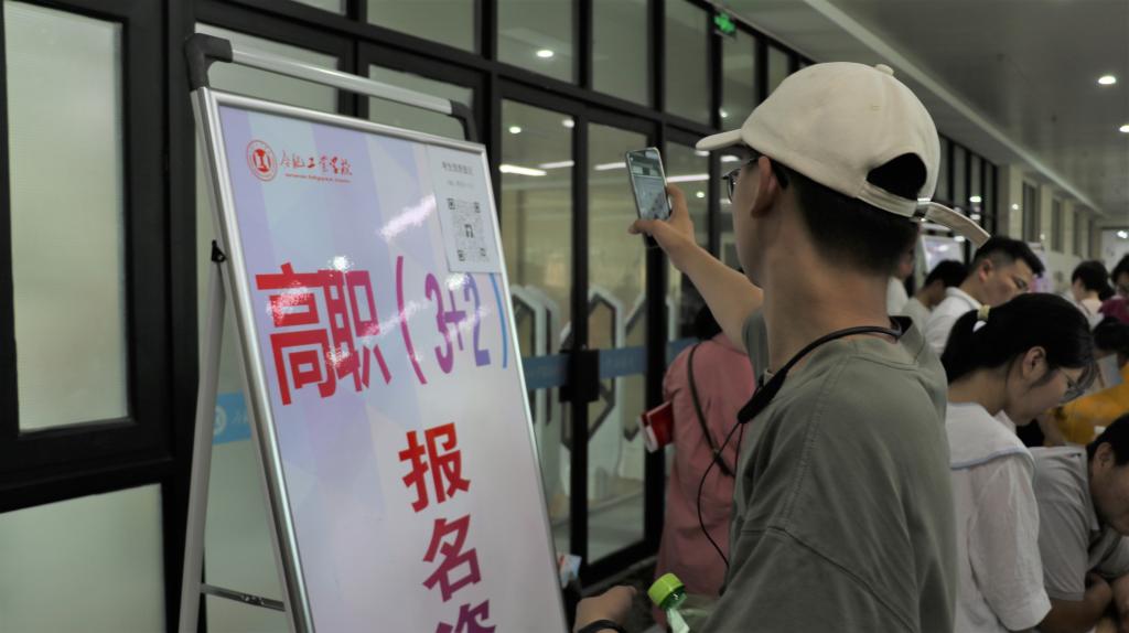 在新生报名咨询处,学校设置了5个报名接待台,分别提供职教高考、高职(3+2)、普通中专报名咨询,前来咨询的考生、家长络绎不绝。