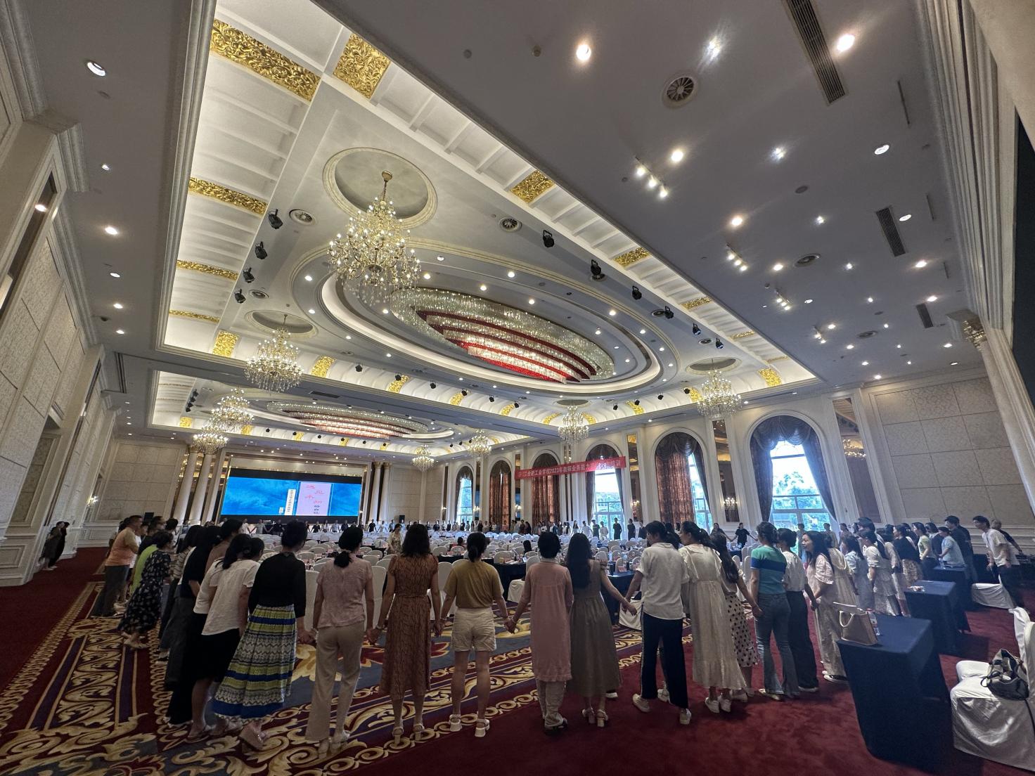 最后,万老师进行了一个“我要长大”的团体活动。所有老师围绕会场围成一个大大的圈走起来,再根据现场情况变换圆圈的大小,最后前面的老师坐在后面老师的腿上。虽然很多老师表现出很尴尬,但看到别的老师完成任务自己也尽力完成任务。