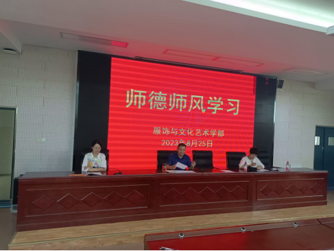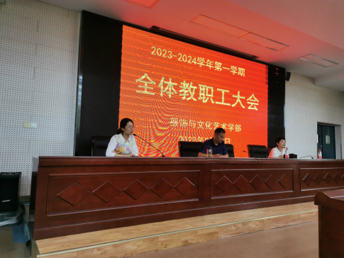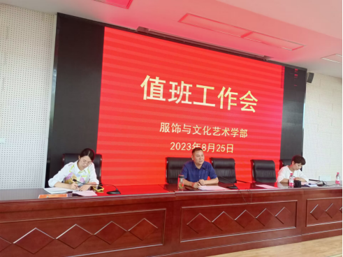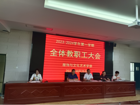 为确保新学期开学各项工作能够有序开展,8月25日服饰与文化艺术学部在323阶梯教室召开全体教职工会议。会议由学部主任邓传国同志主持,校党委副书记、校长孙健同志及校教研室主任李风华同志到会指导。会议在总结过去的同时对新学期各项工作的开展提出了新的规划与要求,并强调了师德师风建设的重要性。