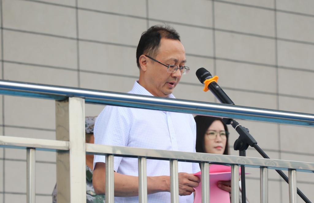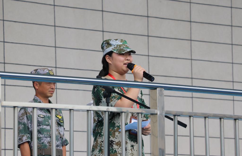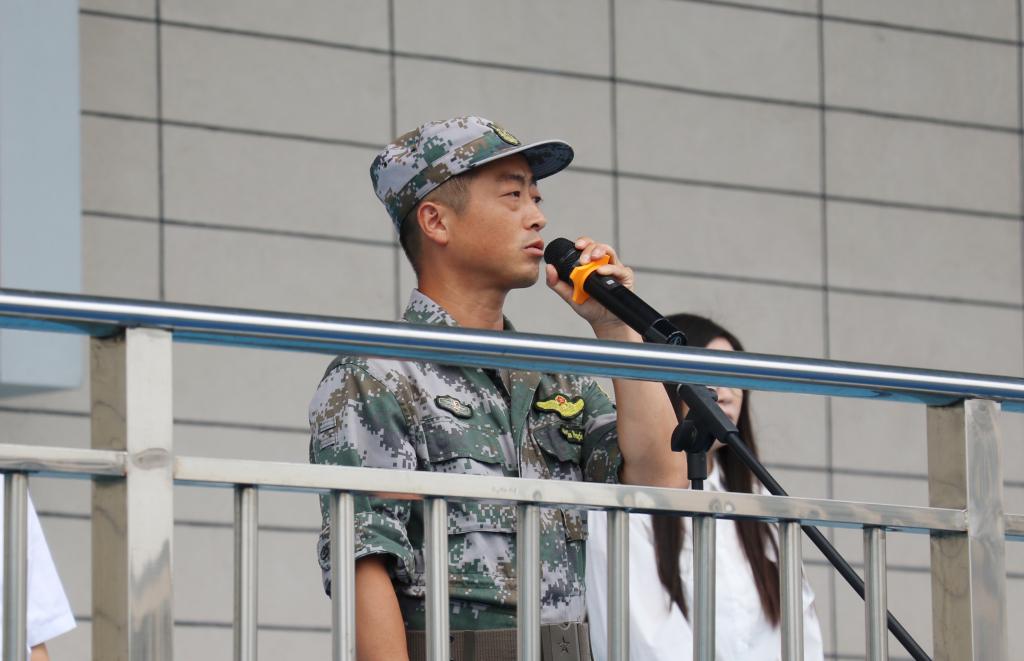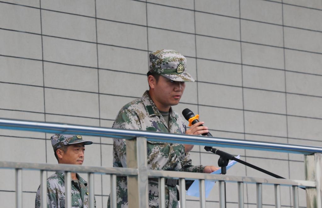 军训队长朱朋飞致辞。他给即将参训的新生提出了三点要求:一是服从教官指挥,尊重教官;二是不怕苦,不怕累,认真地跟随教官学习;三是注意安全,保护好自身。对于带领学生军训的教官,他提出了两点要求:一是爱护同学,关心同学;二是严格要求同学,传递优秀精神和品质。