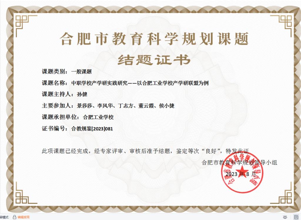 8月底,在合肥市教育科学规划课题结题工作,我校方英、孙健、束其杰等课题主持人的市级课题已顺利结题,分别获得优秀、良好、合格等次,取得喜人教育科研成果。