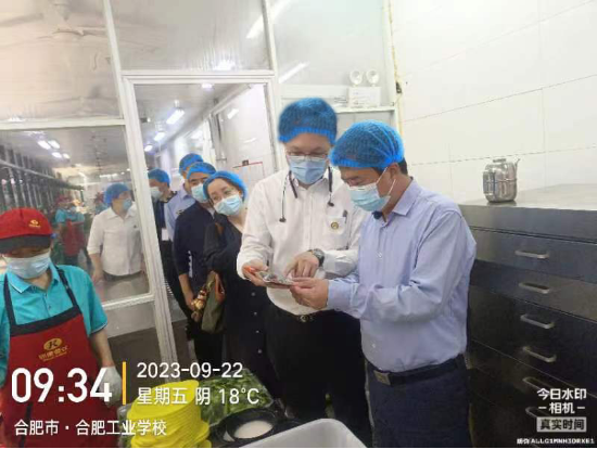 为进一步加强食品安全监管工作,强化食品安全保障,合肥市学校食堂包保督导组于2023年9月22日上午对合肥工业学校第一食堂、第二食堂进行督导检查。督导组组长陈勇副局长、张静处长和新站区食药所刘军所长及相关工作人员在校党委书记杨三龙和校食品总监张宗权、总务处处长蒋晓宏陪同下对食堂全面检查。