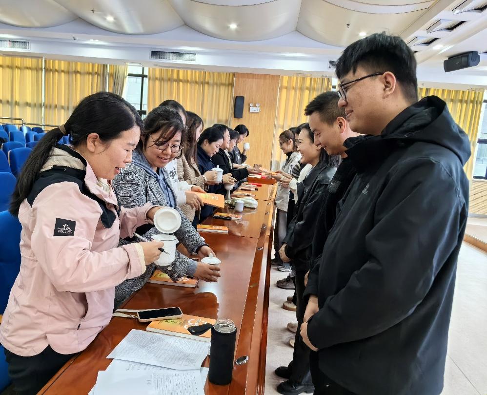 余雨声等八位第七届青方老师为陈莉等蓝方老师行敬茶,表达了拜师之意,表示对师傅的尊重和感激之情。同时,蓝方老师回赠了图书《优秀教师养成路》并附寄语,希望年轻教师能够早日成为优秀的职教人。
