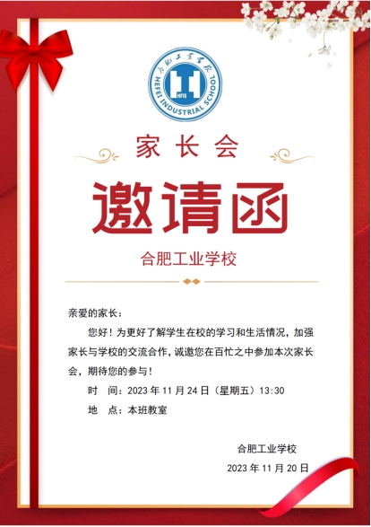 为进一步加强家校沟通合作,共同探讨孩子的健康成长,建立合作赋能的家校关系,更好地让家长了解孩子的校园学习生活,展现合肥工业学子的拼搏向上的青春风貌以及我校的办学理念和特色。11月24日,开展为期一天家长开放日活动,让家长沉浸式体验孩子在校的学习生活等方面的了解,同时各班级召开“我与家长共育人”主题家长会。