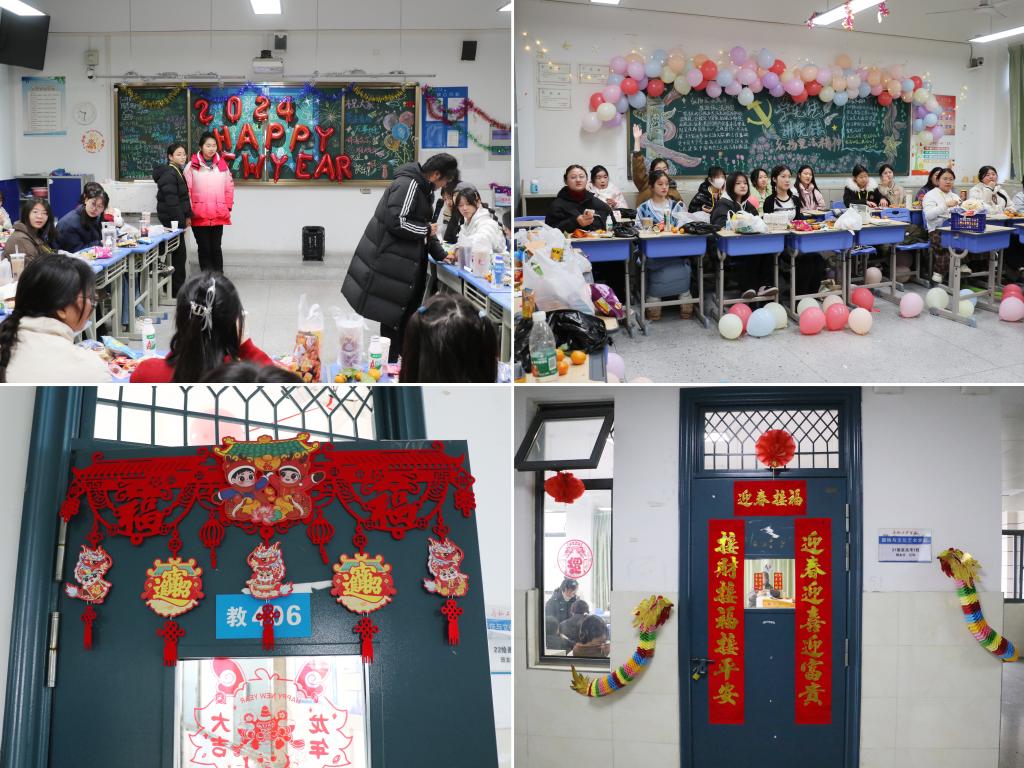 金鼓齐鸣颂盛世,师生欢聚祝安康。在这个喜庆的日子里,同学们也在庆祝佳节的到来。29日上午,学校以班级为单位举行了元旦迎新联欢活动。各班教师和学生齐心协力,利用福字、气球、彩带等对班级室内外进行精心布置,营造了浓郁的节日氛围。每个班级都精心准备了节目,同学们以歌曲、舞蹈、诗歌朗诵、小游戏等多种表现形式辞旧迎新。校园里一片欢声笑语,一派浓烈醉人的喜庆气氛。