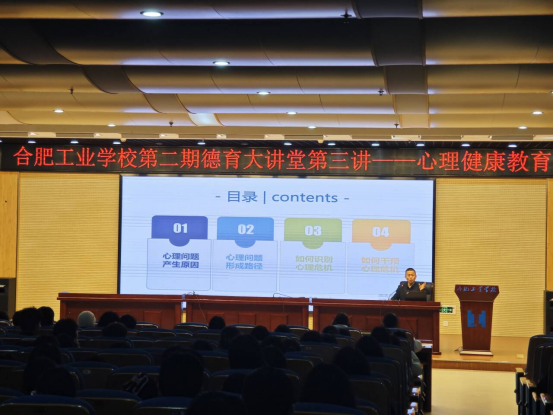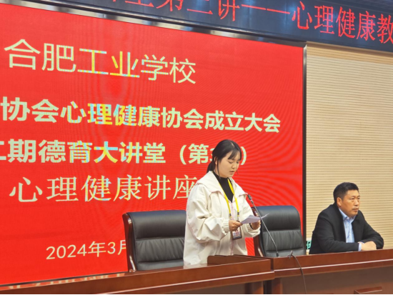 为关注在校学生的心灵,共同提高生命质量以及同学们内心的修养,帮助学生正确地认识自我,健康愉快地学习和生活。2024年3月27日,合肥工业学校在图书楼四楼活动中心开展第二期德育大讲堂(第3讲)心理健康讲座,并举行了心理健康协会成立大会,学校党委委员副校长张宗权、学生处、各学部150余名心理委员参加了此次会议。
