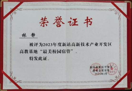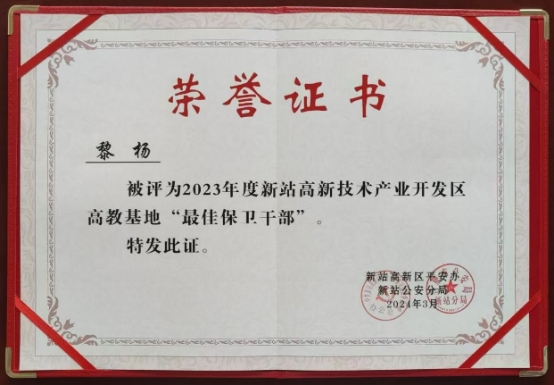 管委会副主任尹旭、新站公安分局局长叶重青分别对我校的枫桥式平安校园创建工作进行点评,充分肯定了学校的安全工作。新站高新区平安办和新站公安分局联合授予我校二零二三年新站高新技术产业区高教基地“最优安全校园”、黎扬同志2023年度新站高新技术产业开发区高教基地“最佳保卫干部”、林静同志2023年度新站高新技术产业开发区高教基地“最美校园宿管”的荣誉。