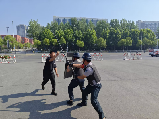 演练前,培训专员对保安队员进行反恐防暴宣传教育,并现场对各种防暴器材和一键报警的使用方法进行详细讲解。演练开始,由一名保安队员扮演“歹徒”试图闯入校园,学校保安上前劝阻并让他离开,他不听劝阻,还突然拿出“菜刀”企图砍向保安,保安队长接报后迅速赶至现场,在报告学校安全保卫处后立即启动学校反恐防暴应急处置预案,反恐防暴应急小组迅速制服“暴恐分子”。