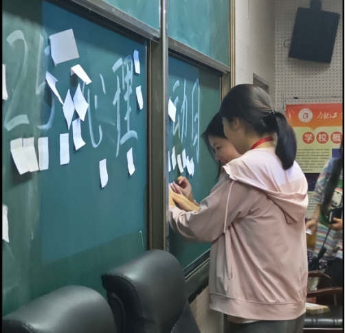 工商学部分会场,学校校心理卫生协会举办了心理团体游戏活动,同学们把自己的烦恼与开心的笑脸写在便利贴上,通过互动交流,让同学们感受温暖与关怀,现场欢声笑语。
