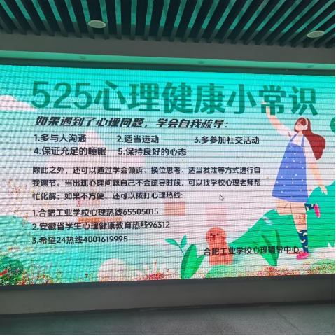 5月22日-5月29日,为了让更多学生心理知识,每个学部都在大屏上滚动播出心理健康小常识,掌握几种自我疏导办法。