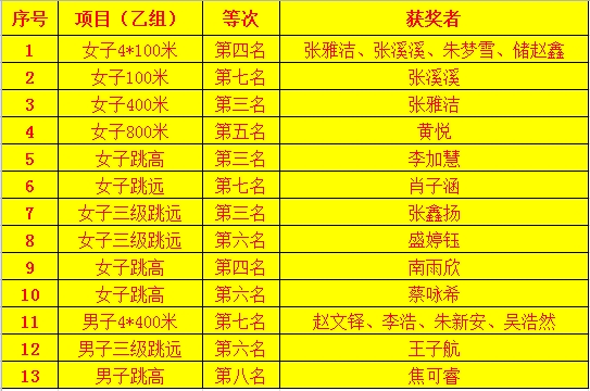 女子乙组4*100米,我们的队伍取得了第四名的好成绩。男子乙组4*400米,我们的队伍虽位列第七,但每一位队员都展现了坚韧不拔的精神风貌。