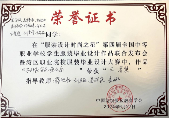 2024年6月27日,由中国纺织服装教育学会主办的“服装设计时尚之星”第四届全国中等职业学校学生服装专业毕业设计作品联合发布会暨湾区职业院校服装毕业设计大赛在广州举行,此次比赛汇聚全国各地服装专业学生的优秀毕业设计作品。我校服饰与文化艺术学部学生王伍凤、赵籽涵、杨欣雨、刘雪晴、于淼淼、吴羽晗、杨淑婷、何应芝、方楚楚携手完成的毕业设计作品《子非鱼,安知鱼之乐》,在蒋欣怡、吴洪庆、刘亚丽、孟娜等任课教师和班主任的精心指导下,荣获了三等奖的佳绩。
